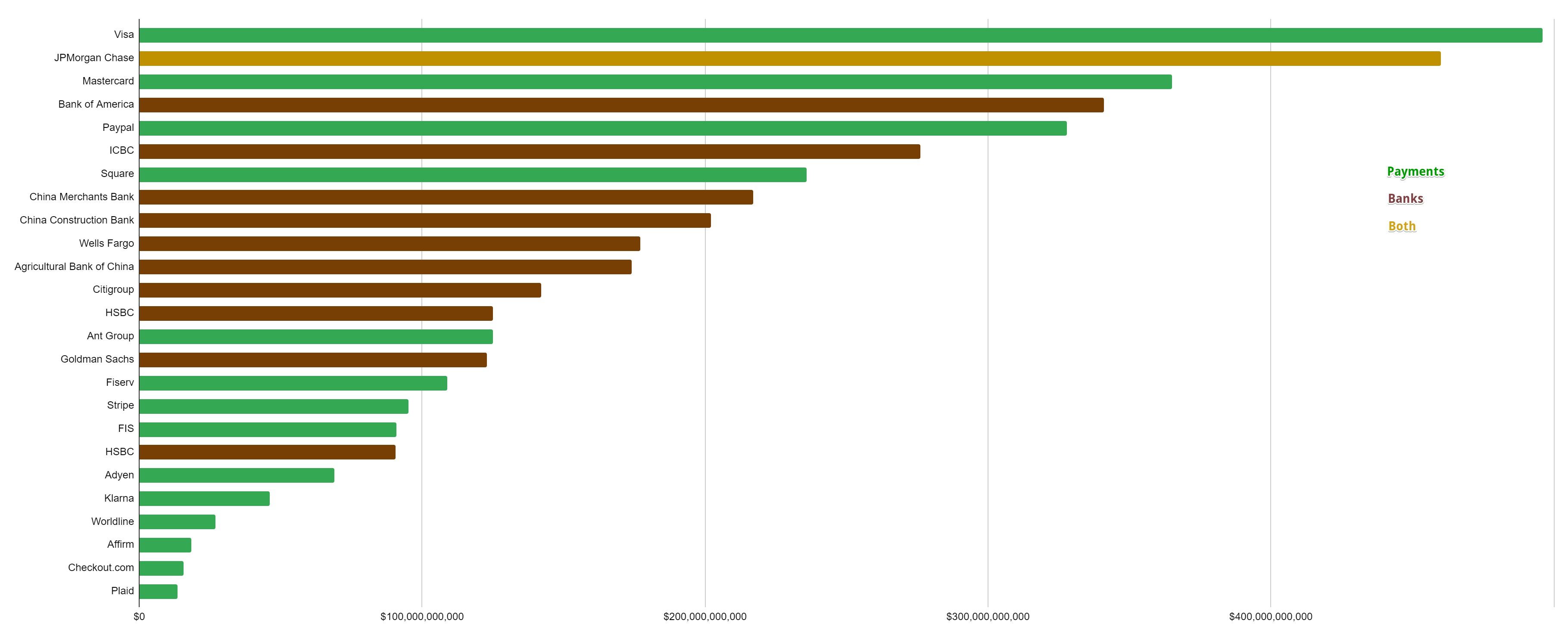 To finish illustrating my point, here are the latest market cap / valuations of the largest banks vs. payments companies.